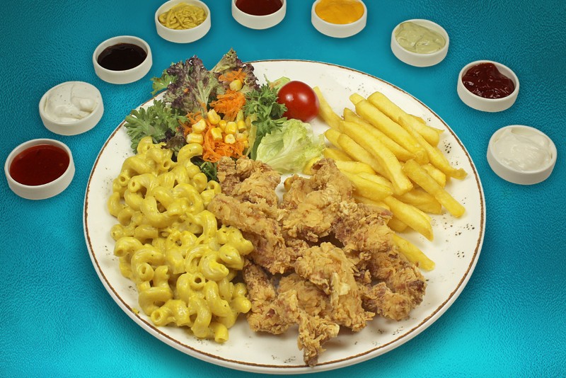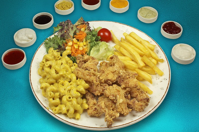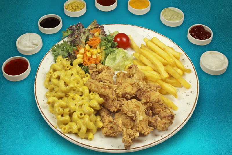 Çıtır kaplamalı bonfile tavuk dilimleri + CHEDDAR SOS + patates kızartması + pesto soslu makarna ve mix salata ile.