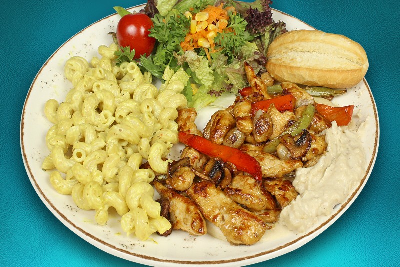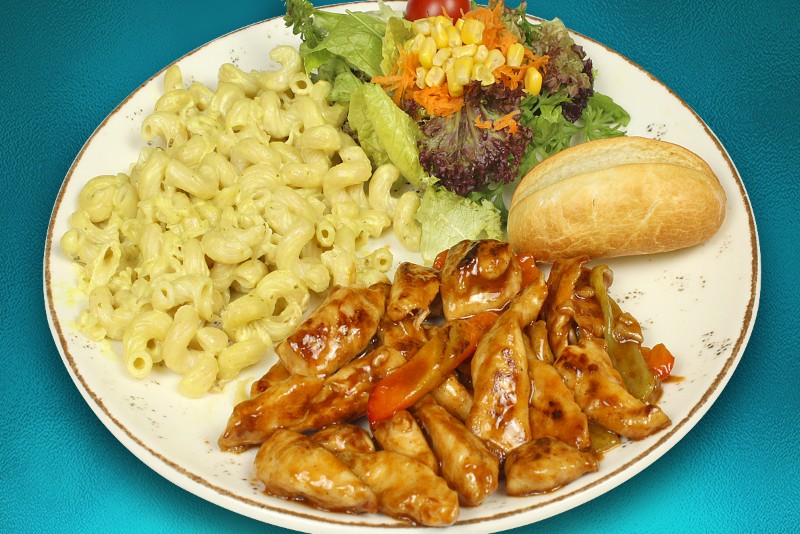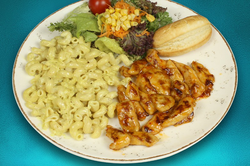Julyen tavuk dilimleri + Barbekü sos + California biber + Pesto soslu makarna + Mix salata ve 1 ad. Baget ekmek eşliğinde