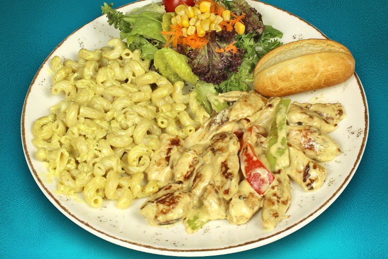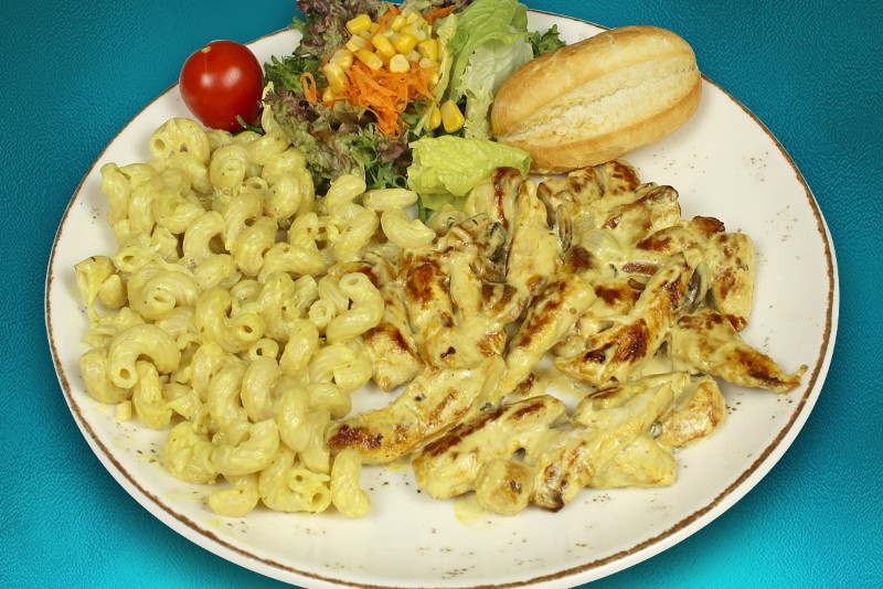 Julyen tavuk dilimleri + Cafe de Paris sos + Krema + California biber + Pesto soslu makarna + Mix salata ve 1 ad. Baget ekmek eşliğinde