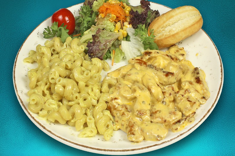 Julyen tavuk dilimleri + Cheddar sos + Krema + California biber + Pesto soslu makarna + Mix salata ve 1 ad. Baget ekmek eşliğinde