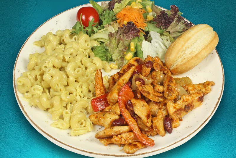 Julyen tavuk dilimleri + Meksika fasulyesi + Meksika sos + Jalapeno biber + California biber + Pesto soslu makarna + Mix salata ve 1 ad. Baget ekmek eşliğinde