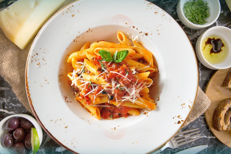 Arabiatta sos + Rende Parmesan ve Çeri domates eşliğinde
